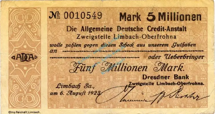 Limbach , Banknote 5 Millionen Mark Schein gbr. Bühn 4727.16 , Sachsen 1923 Inflation