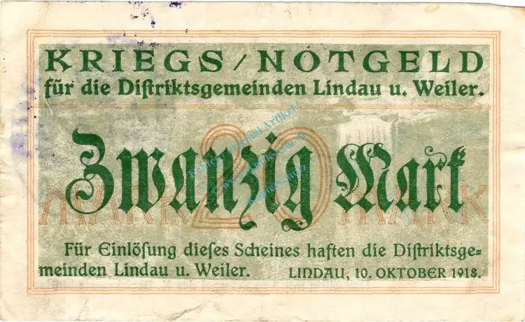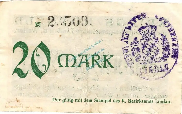 Lindau , Banknote 20 Mark Schein gbr. Geiger 322.02 , Bayern 1918 Grossnotgeld