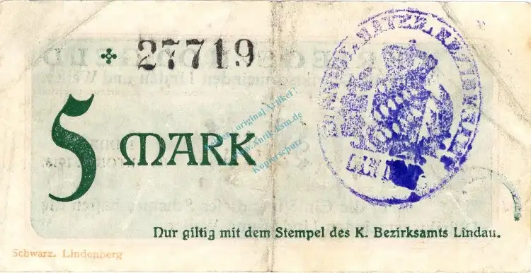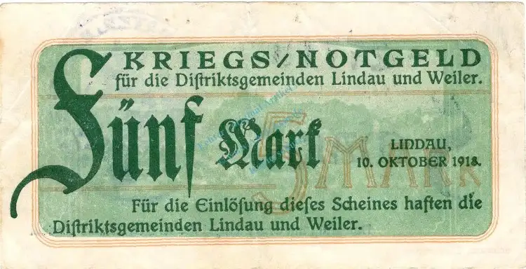 Lindau , Banknote 5 Mark Schein gbr. Geiger 322.01 , Bayern 1918 Grossnotgeld
