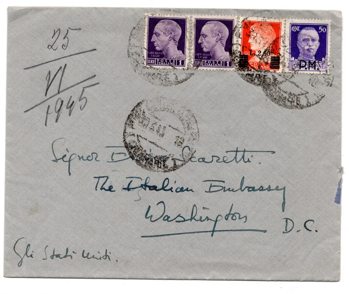 Umschlag - Lire 2,50 auf 1,75 Nr. 523 + Ergänzungen Nr. 522 x 2 + Cent. 50 P.M. Nr. 7 auf Umschlag von Rom in die USA am 30.6.45 - auf der Rückseite ovaler Stempel Military Censor Ship - Uncommon Cod. 219/17