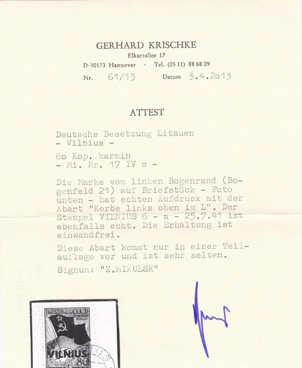 Litauen: MiNr. 17 IV, gestempelt, linker Bogenrand, Briefstück Vilnius