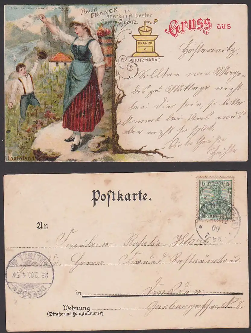 Litho 26.12.1900 Aecht Franck anerkannt bester Caffee-Zusatz, Kaffeemühle, Weinberg Rheinland Gruss aus Hosterwitz