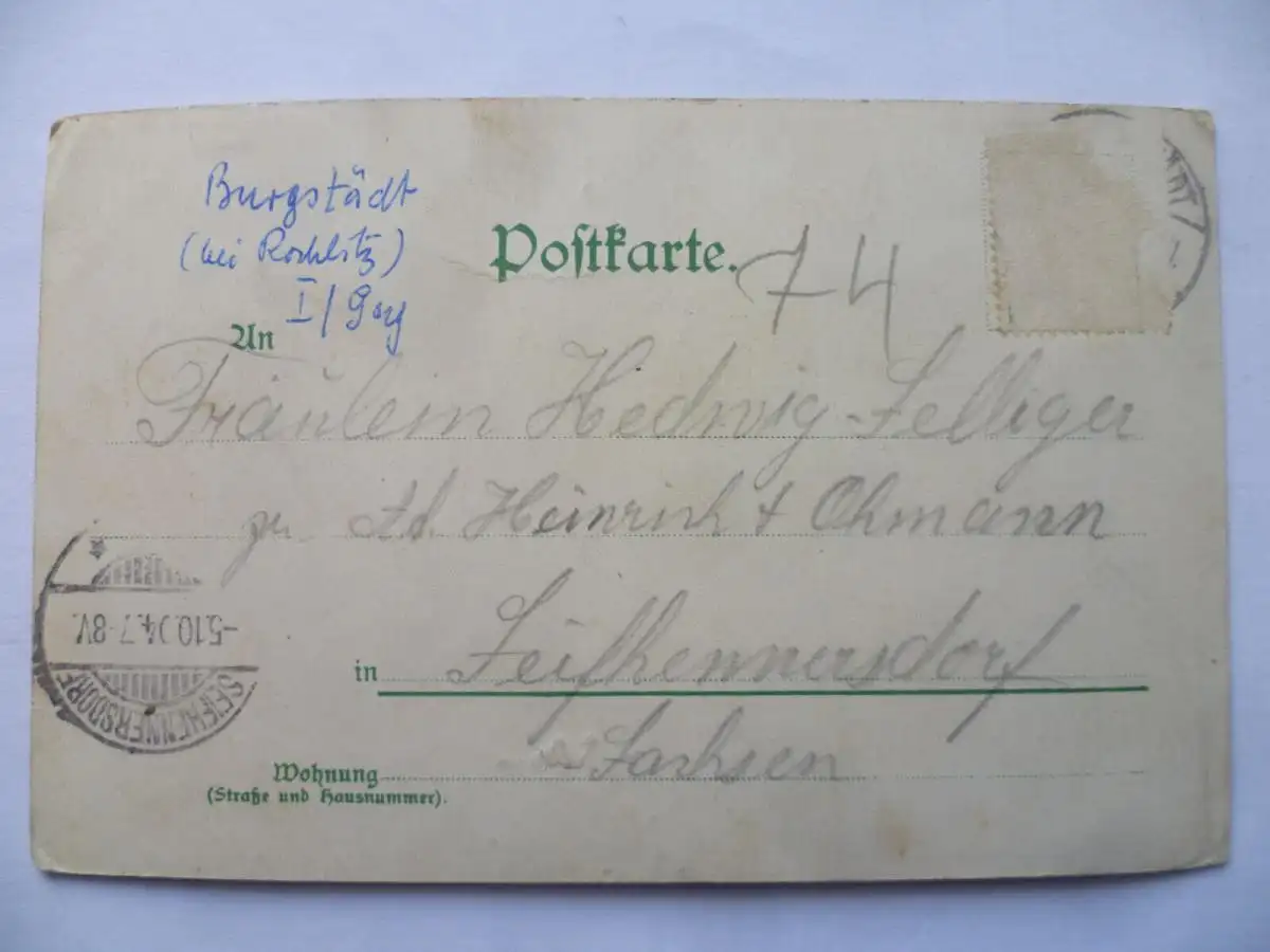 Verlag R. Lindner, Burgstädt. Gelaufen 1904, Marke entfernt. Gut erhalten.