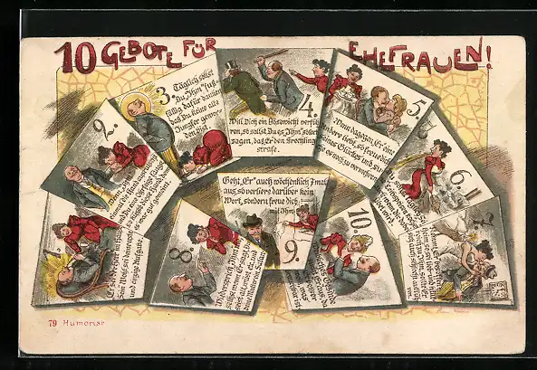 Lithographie 10 Gebote für Ehefrauen, frauenfeindlicher Humor