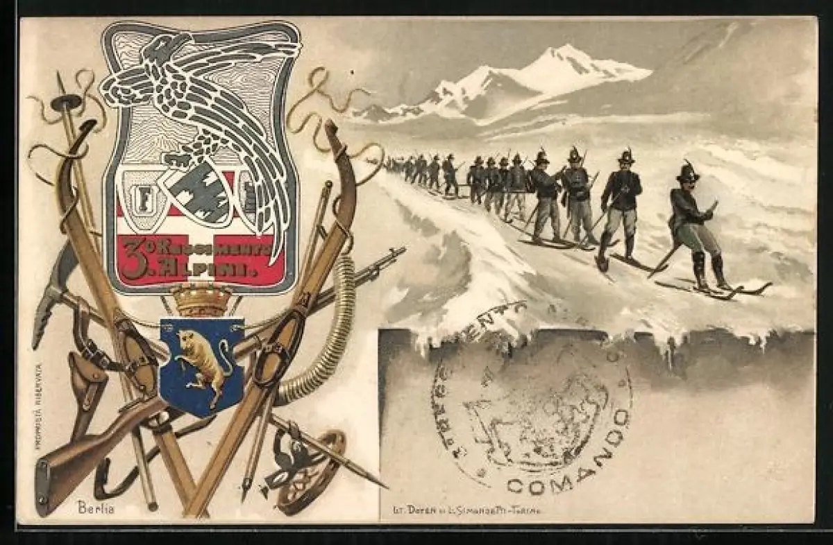 Lithographie 3 Reggimento Alpini Gebirgsjäger Ski Patrouille Schneeschuhe Spitzhacke Bergausrüstung