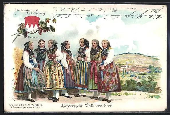 Lithographie 7 Frauen in bayrischer Volkstracht vor Uettingen