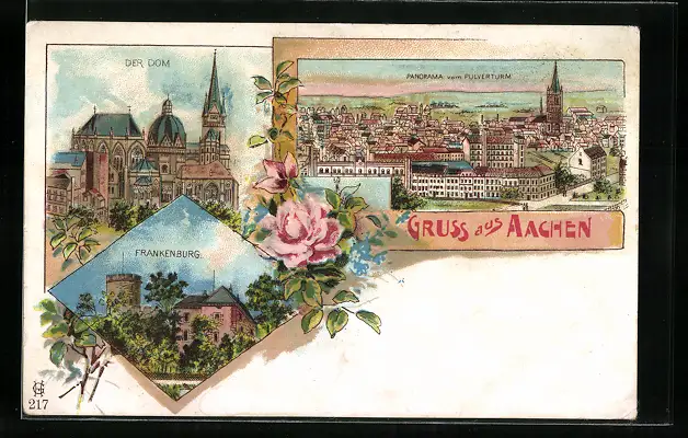 Lithographie Aachen, Panorama vom Pulverturm, Dom, Frankenburg