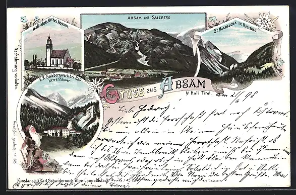 Lithographie Absam b. Hall, K. K. Salzbergwerk bei Hall, St. Magdalena und Wallfahrtskirche