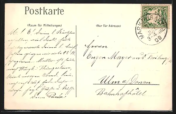 Personenbezogene Daten auf der Rückseite der Karte wurden durch blauen Textmarker unkenntlich gemacht. Die blauen Stellen sind auf die Vorderseite durchgeweicht und wirken sich negativ auf das Postkartenfoto aus