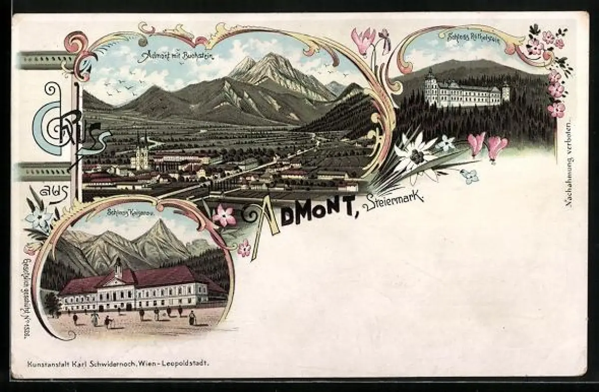 Lithographie Admont, Schloss Röthelstein, Schloss Kaiserau, Ortsansicht mit Buchstein