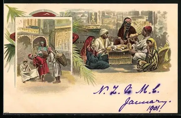 Lithographie Ägypten, Familie beim Essen, MMänner auf dem Markt