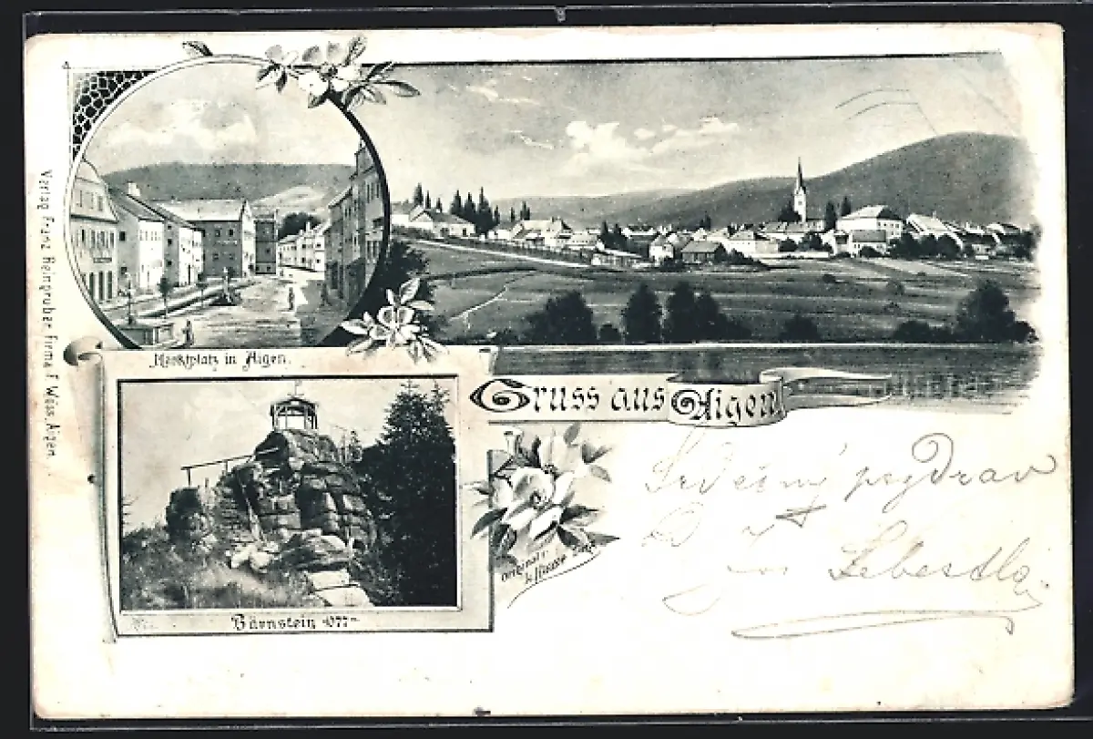 Lithographie Aigen /O.-Oe., Marktplatz, Bärnstein, Ortsansicht mit Kirche