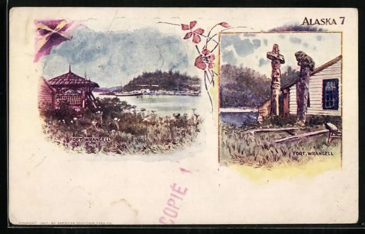 Lithographie Alaska, AK, Fort Wrangell, Totempfahl