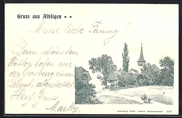 Lithographie Albligen, Ortspartie und Frau mit Kind