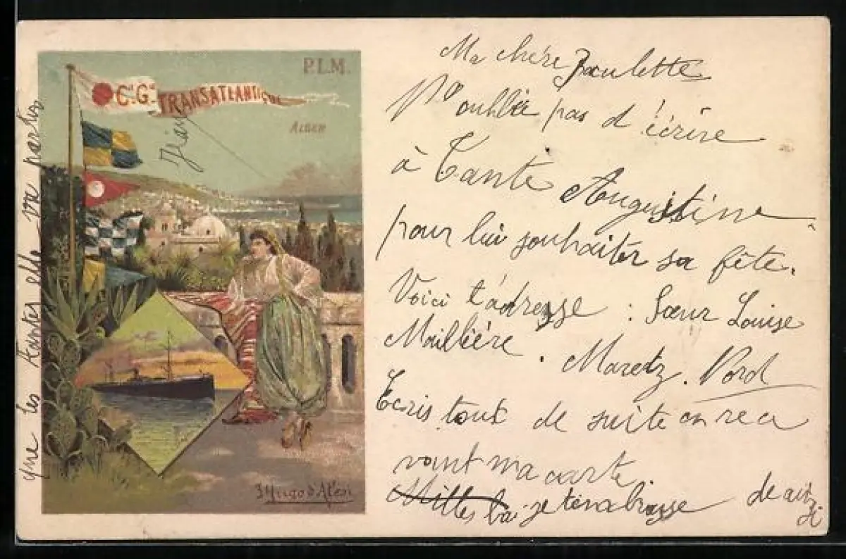 Lithographie Alger, Cie Gle Transatlantique, Frau in Tracht, Schiff, Tourismus