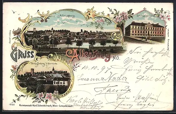 Lithographie Allentsteig /N.Ö., Landessiechenhaus, Oberer Stadtplatz m. d. Pfarrkirche, Gesamtansicht