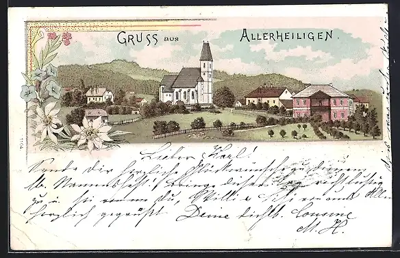 Lithographie Allerheiligen im Mürztal, Ortsansicht mit Kirche