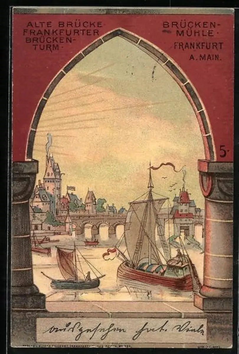 Lithographie Alt-Frankfurt, Blick auf Alte Brücke, Brückenmühle, Schiffe