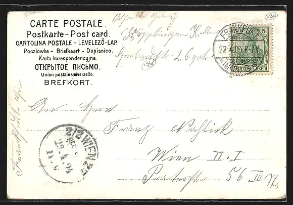 gelaufen 1904, geklebter Einriss oben Mitte, Stempelspur, guter Zustand