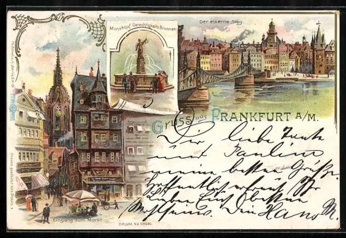 Lithographie Alt-Frankfurt, Eiserner Steg, Gerechtigkeitsbrunnen, Eingang zum Markt