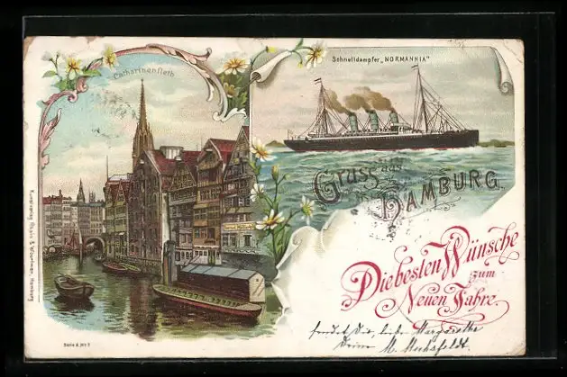 Lithographie Alt-Hamburg, Katharinenfleet mit Geschäft und Booten, Schnelldampfer Normannia in Fahrt