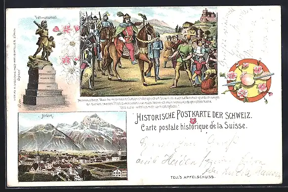 Lithographie Altdorf, Teilansicht, Tellmonument, Wohlan o Herr...