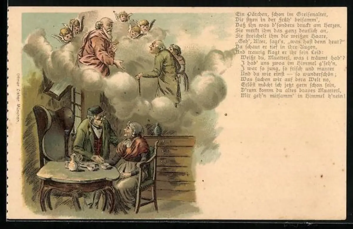 Lithographie Altes Paar sinniert über den Aufstieg ins Himmelreich, Vergänglichkeit