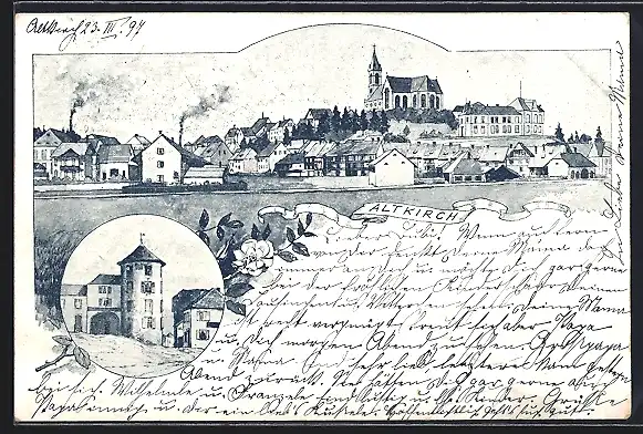 Lithographie Altkirch, Teilansicht mit Kirche, Ortspartie