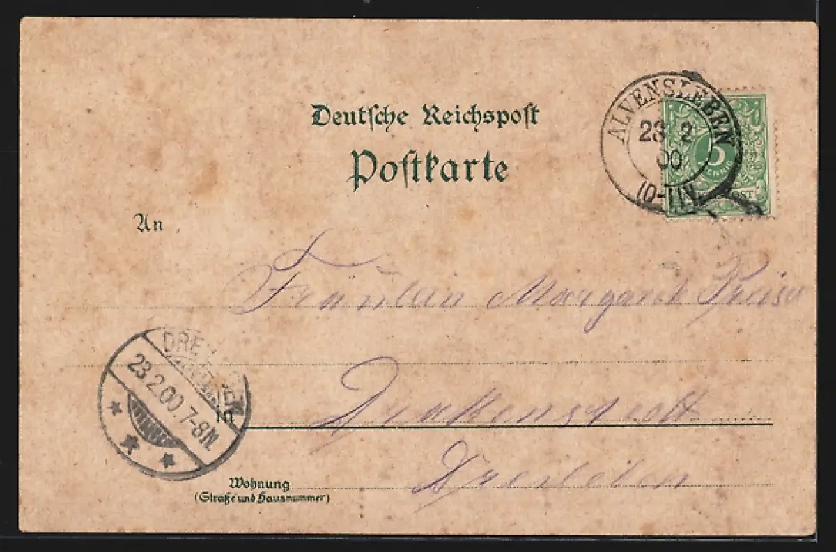 Personenbezogene Daten auf der Rückseite der Karte wurden durch blauen Textmarker unkenntlich gemacht. Die blauen Stellen sind auf die Vorderseite durchgeweicht und wirken sich negativ auf das Postkartenfoto aus