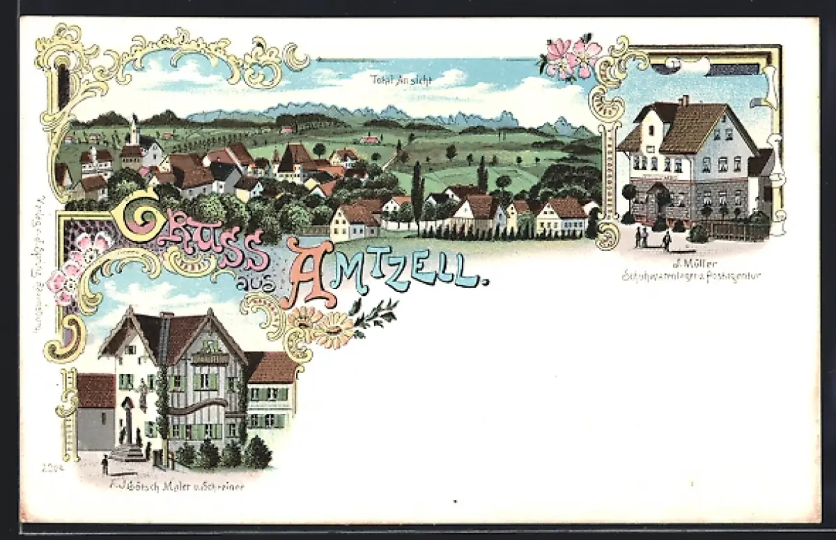 Lithographie Amtzell, Maler und Schreiner F. J. Götsch, Schuhwarenlager J. Müller