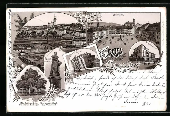 Lithographie Annaberg, Theater, Barbara Uttmann-Denkmal, Realgymnasium