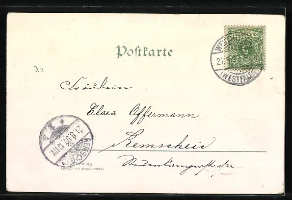 Personenbezogene Daten auf der Rückseite der Karte wurden durch blauen Textmarker unkenntlich gemacht. Die blauen Stellen sind auf die Vorderseite durchgeweicht und wirken sich negativ auf das Postkartenfoto aus
