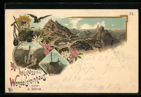 Lithographie Ansicht vom Wendelsteinhaus, Wendelstein-Kirchlein, Gipfel