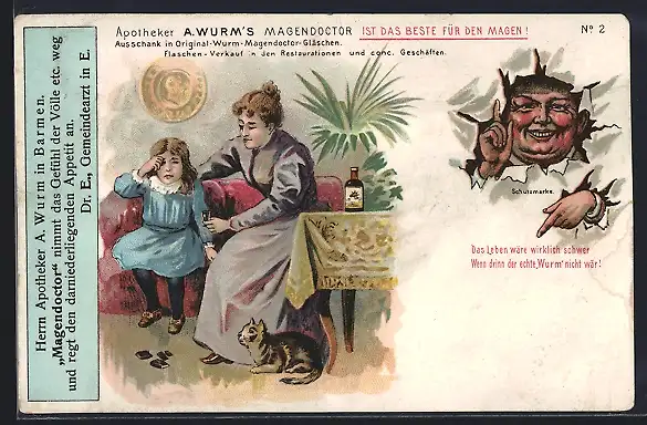 Lithographie Apotheker A. Wurm`s Magendoctor, Ausschank in Original-Wurm-Magendoctor-Gläschen