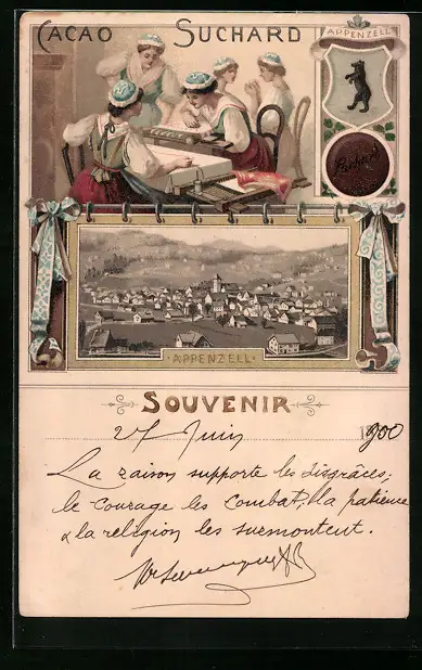 Lithographie Appenzell, Gesamtansicht, Weberinnen in Trachten, Wappen