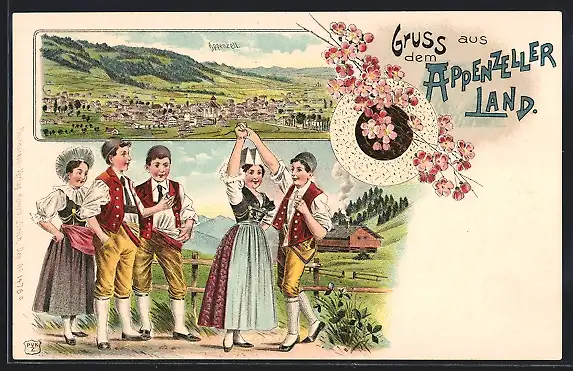 Lithographie Appenzell, Totalansicht, Kinder in Trachten
