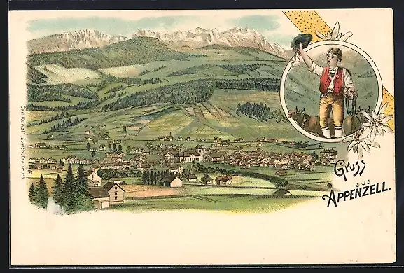 Lithographie Appenzell, Totalansicht gegen die Berge, Mann in Tracht