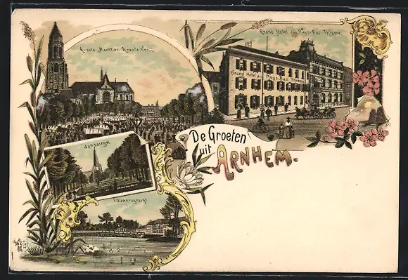 Lithographie Arnhem, Grand Hotel des Pays-Bas-Thieme, Lauwersgracht, Groote Markt en Groote Kerk
