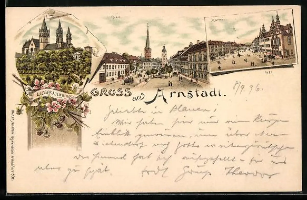 Lithographie Arnstadt, Marktplatz, Ried, Liebfrauenkirche