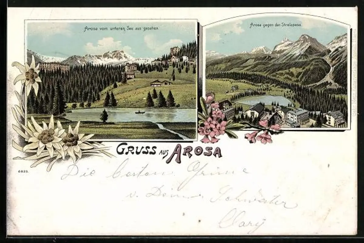 Lithographie Arosa, Ortsansicht von unteren See aus, Blick gegen den Strelapass
