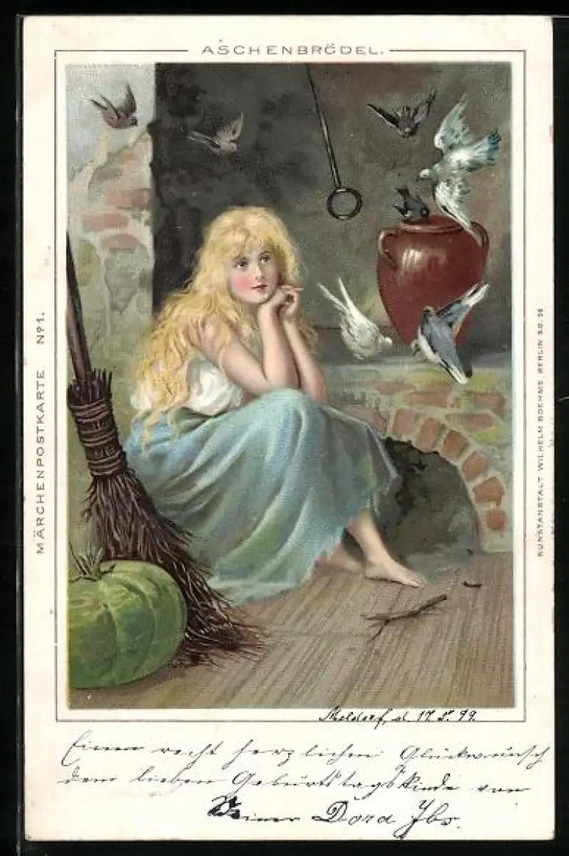 Lithographie Aschenbrödel sitzt mit ihren Vögeln zusammen