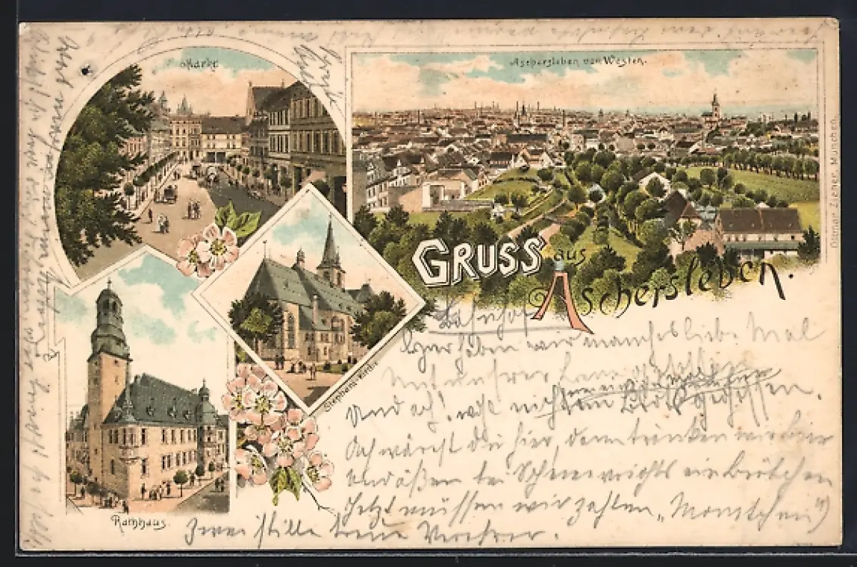 Lithographie Aschersleben, Markt, Stephanikirche, Rathaus