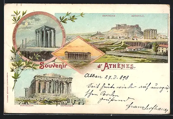 Lithographie Athènes, Temple de Jupiter, Acropole, Parthénon