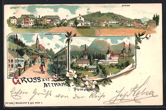 Lithographie Attnang-Puchheim, Ortsansichten von oben, Strassenpartie in Attnang