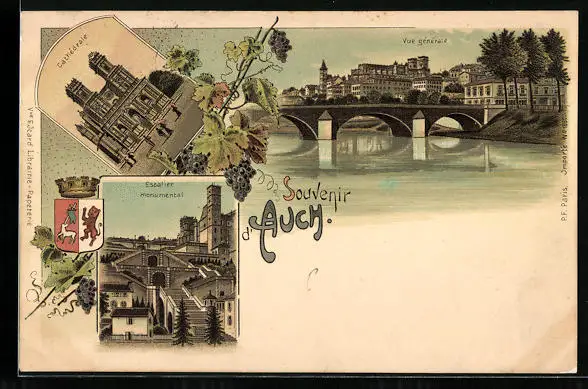 Lithographie Auch, Escalier Monumental, Cathédrale, Vue Générale, Wappen