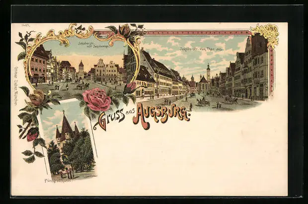 Lithographie Augsburg, Jakoberstrasse mit Jakoberthor, Jakoberstrasse vom Thor aus, Fünfgradthurm