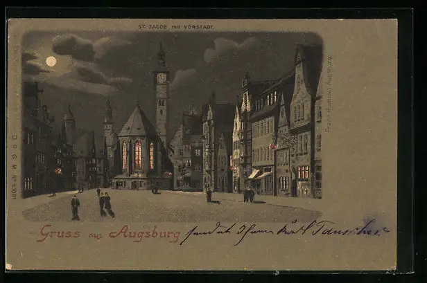 Lithographie Augsburg, Kirche St. Jacob mit Vorstadt bei Mondschein