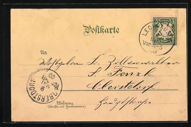 Personenbezogene Daten auf der Rückseite der Karte wurden durch blauen Textmarker unkenntlich gemacht. Die blauen Stellen sind auf die Vorderseite durchgeweicht und wirken sich negativ auf das Postkartenfoto aus