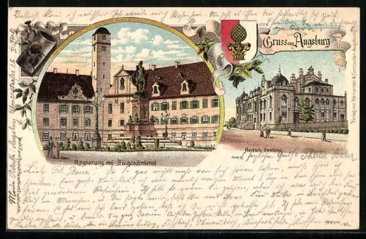 Lithographie Augsburg, Regierung mit Siegesdenkmal, Herries Saalbau