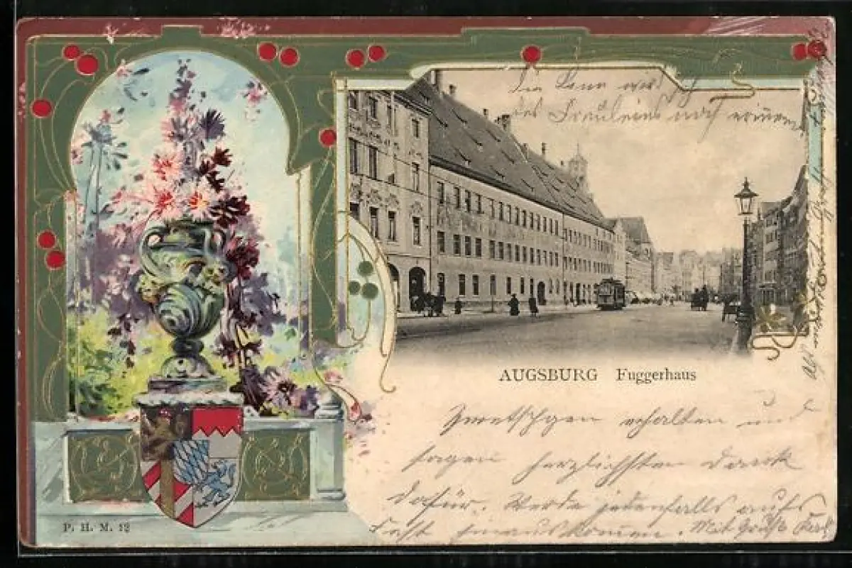 Lithographie Augsburg, Strassenbahn am Fuggerhaus, Laterne